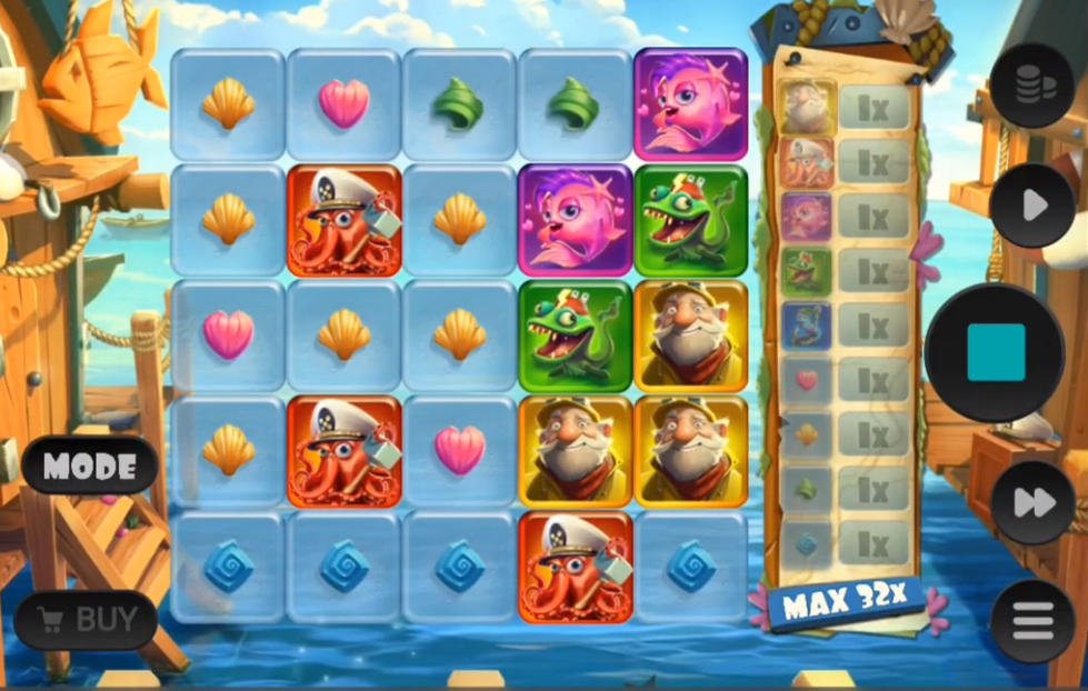 Лучше сначала разобраться с режимами, и нажатие кнопки «Режим» позволит вам изменить их. Возможные варианты: средняя , ​​высокая и чрезвычайно высокая волатильность . Изменяется не только волатильность, но и максимальный выигрыш и максимальные множители базовой игры – подробнее об этом скоро. Внешний вид Lure of Fortune также меняется в зависимости от режима. В среднем режиме в ясный день светит солнце, заставляя воду сверкать. Переход в режим высокой летучести означает, что начинает идти дождь, тогда как режим высокой летучести происходит во время снега. Независимо от режима, графика очень хорошо сделана, очень детализирована, с аккуратным сочетанием симпатичных персонажей.